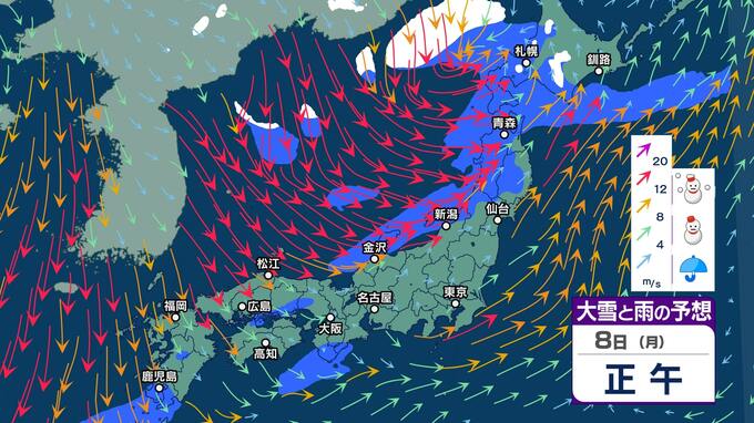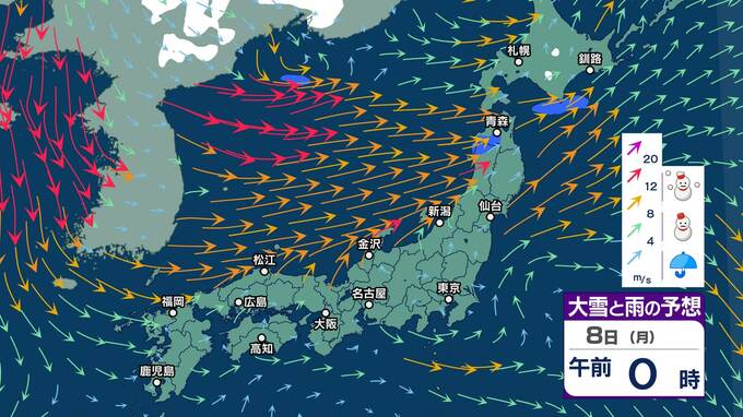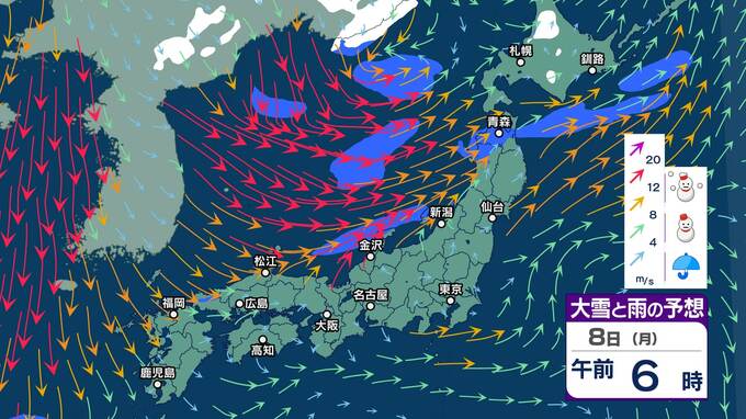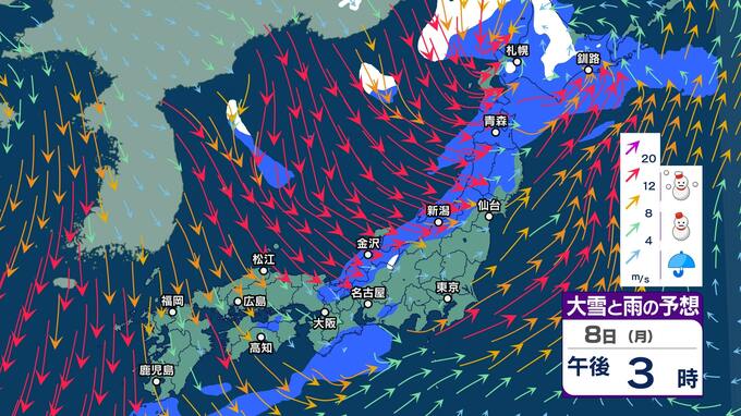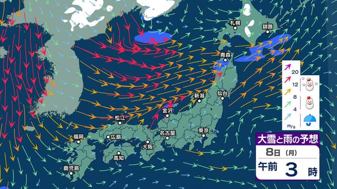 【大雪情報】関東北部・甲信で40センチの降雪か(4日6時までの予想24時間降雪量)関東甲信地方の上空約5500メートルには氷点下30度以下のこの時期としては強い寒気が流れ込む見込み【大雪と雨シミュレーション】 2025年12月3日(水) 09:36 国内 天気 8日(月)大雪と雨シミュレーション