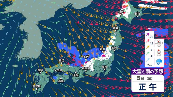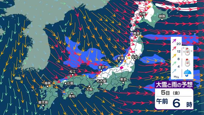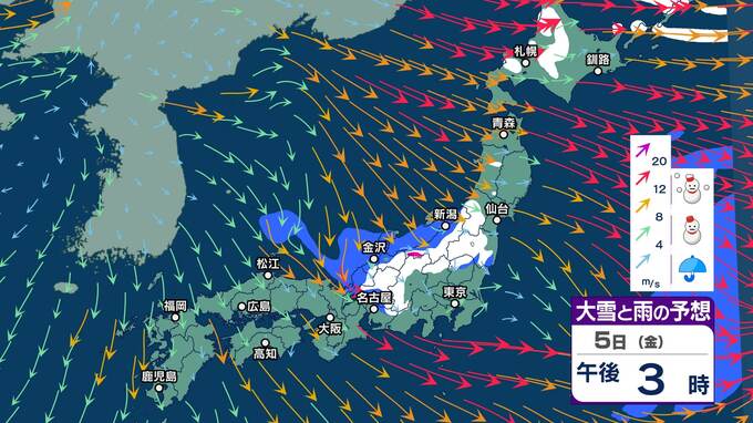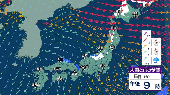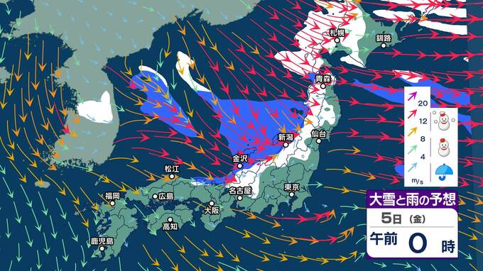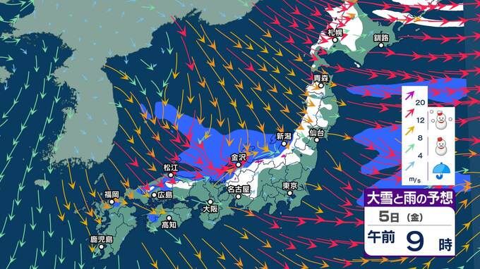【大雪情報】関東北部・甲信で40センチの降雪か(4日6時までの予想24時間降雪量)関東甲信地方の上空約5500メートルには氷点下30度以下のこの時期としては強い寒気が流れ込む見込み【大雪と雨シミュレーション】 2025年12月3日(水) 09:45 国内 天気 5日(金)大雪と雨シミュレーション