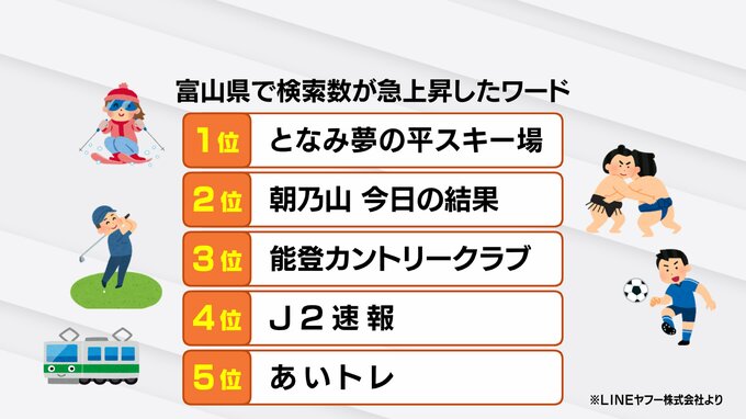 「なぜうちが選ばれたのか」 となみ夢の平スキー場が「Yahoo!検索大賞2025」富山県1位に 入込客数トップ10入らずも“スノーフェスティバル”がヒット 2025年12月3日(水) 20:25 国内 富山の急上昇ワード 富山県の急上昇ワードトップ5です。 1位=となみ夢の平スキー場 2位=朝乃山 今日の結果 3位=能登カントリークラブ 4位=J2速報 5位=あいトレ