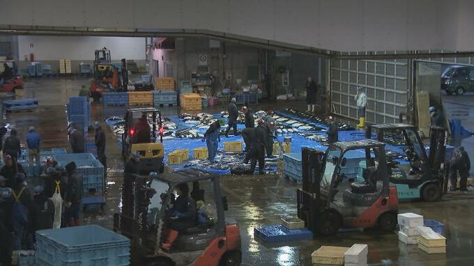 「午前6時の氷見漁港です。けさ水揚げされたブリが続々と並べられています」