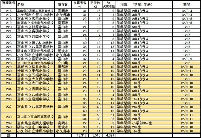ニュースクリップ 【インフルエンザ】小・中・高・支援学校で計14校が学年・学級閉鎖に 前週の1医療機関あたりの患者数49.33人、依然警報レベル上回る 富山 2025年12月8日(月) 19:56 国内 県内学級・学年閉鎖の学校一覧 オレンジ色で塗られた部分が8日発表分(県HPより)