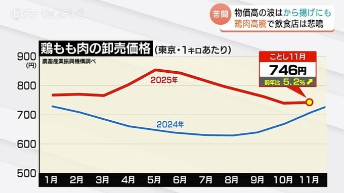 農畜産業振興機構によりますと、鶏もも肉の卸売り価格は前年と比べて上昇傾向に。11月では1キロあたり746円と前年同月比5.2%増となりました。