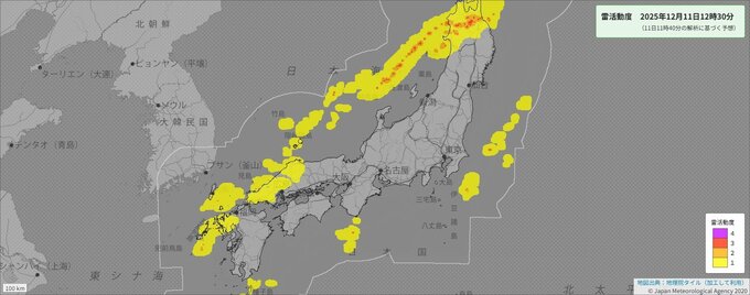 また、近畿地方の上空約5500メートルに、氷点下24度以下の寒気が流れ込むでしょう。近畿地方では、前線に向かって流れ込む暖かく湿った空気や上空の寒気の影響で、11日昼過ぎから12日明け方にかけて、大気の状態が非常に不安定となるため、局地的に雷雲が発達する見込みです。