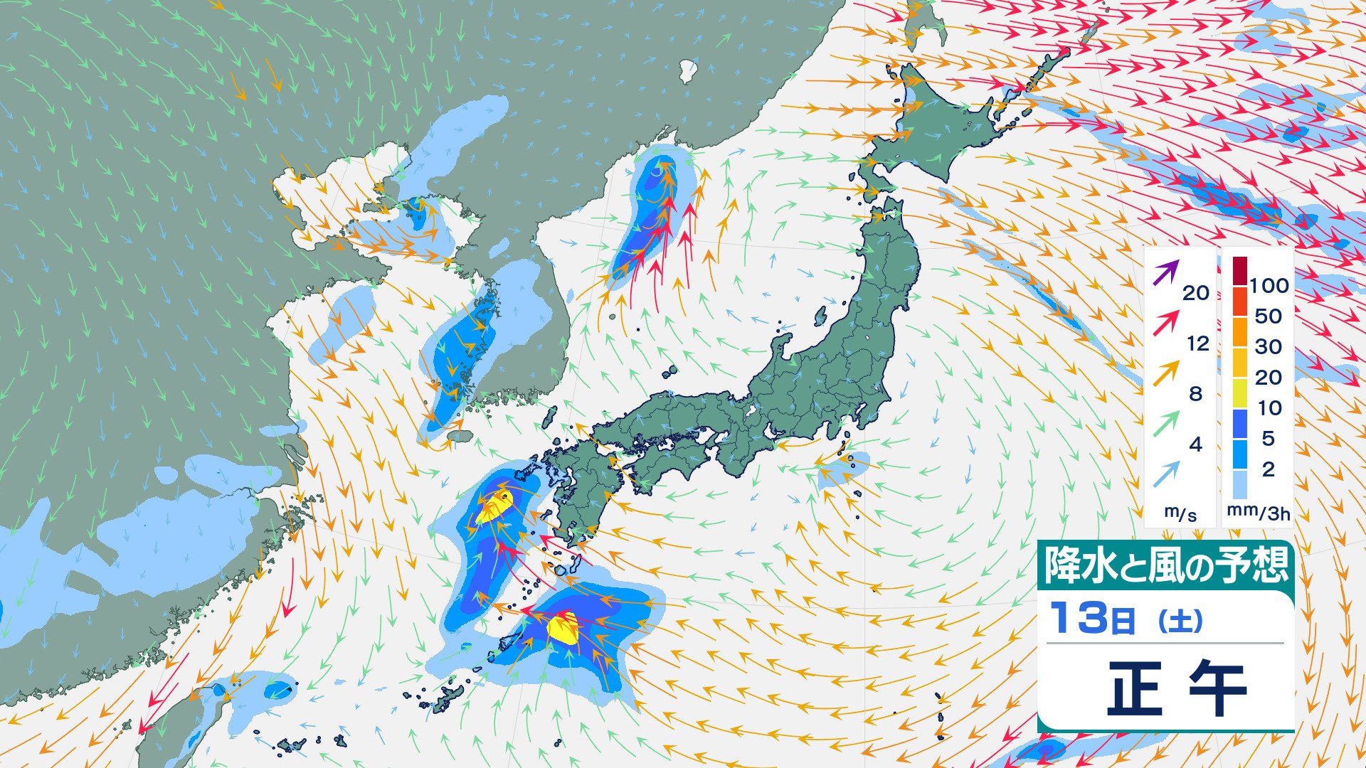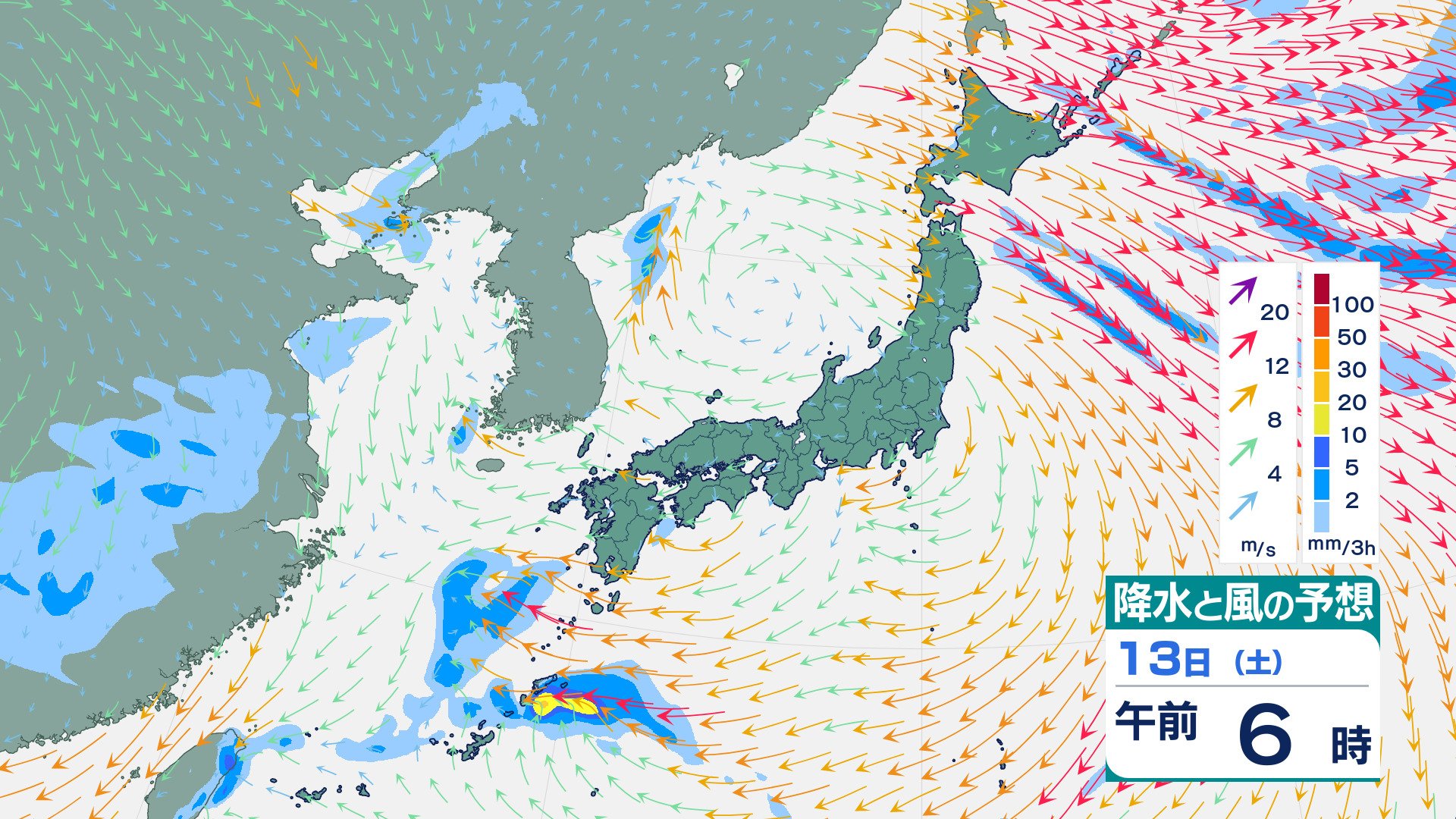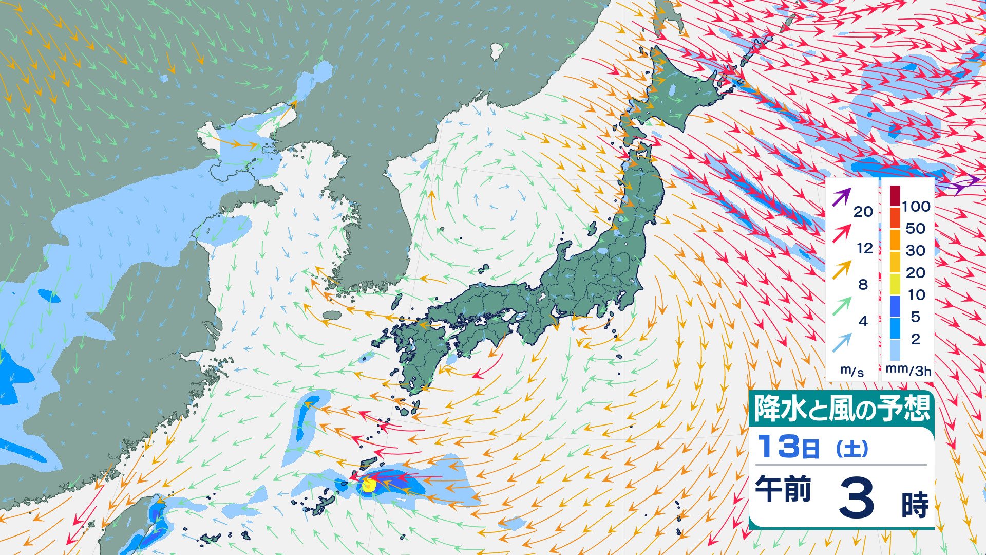 ニュースクリップ 【大雪情報】本州付近では冬型の気圧配置が強まる見込み 東北北部は12日未明から朝にかけて雪を伴った北西の強い風に注意・警戒を【雨風シミュレーション】 2025年12月11日(木) 17:31 国内 天気 13日(土)の雨と風のシミュレーション