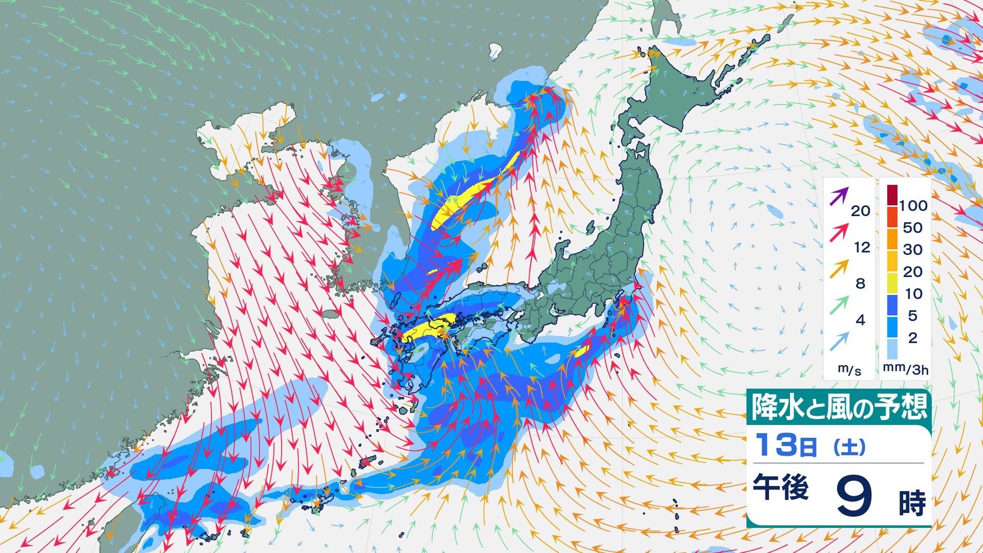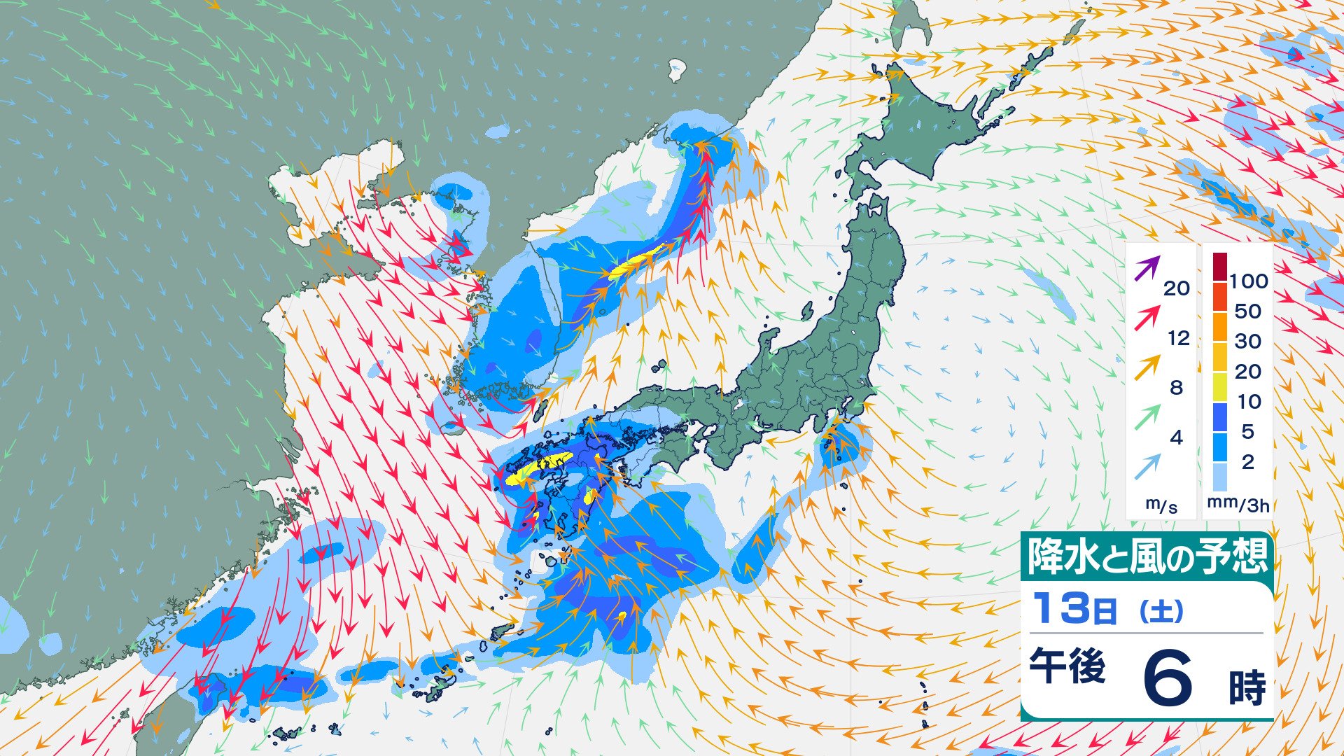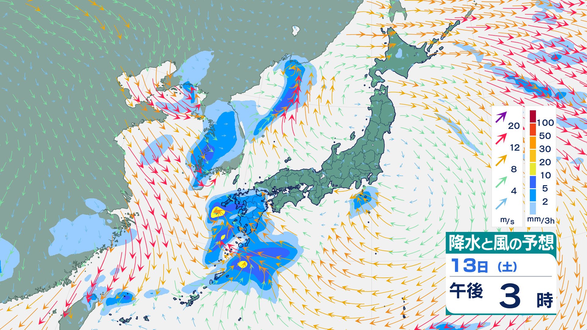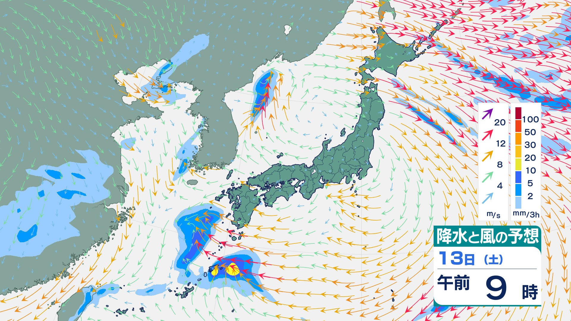 ニュースクリップ 【大雪情報】本州付近では冬型の気圧配置が強まる見込み 東北北部は12日未明から朝にかけて雪を伴った北西の強い風に注意・警戒を【雨風シミュレーション】 2025年12月11日(木) 17:31 国内 天気 13日(土)の雨と風のシミュレーション