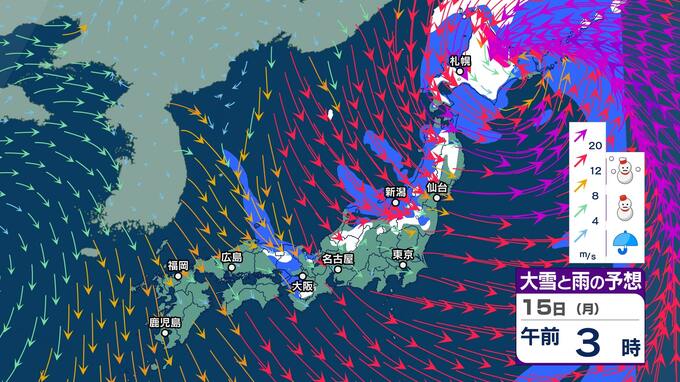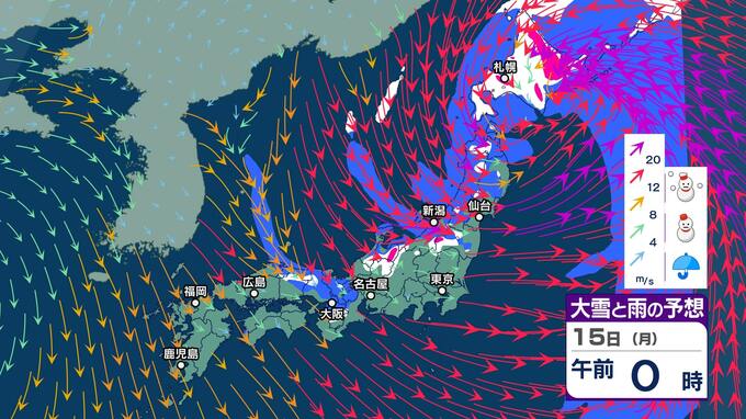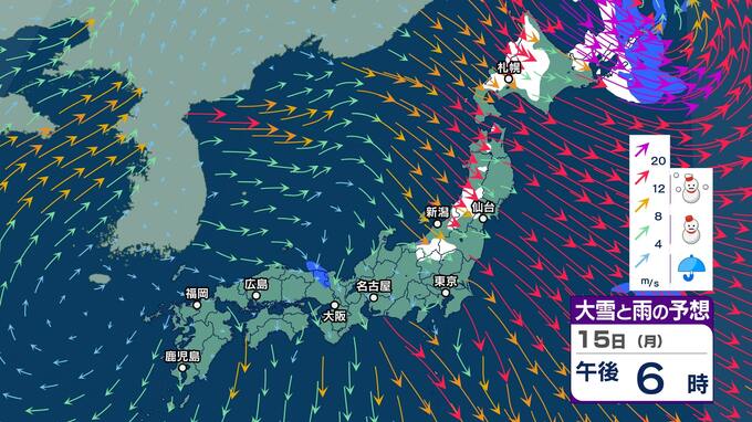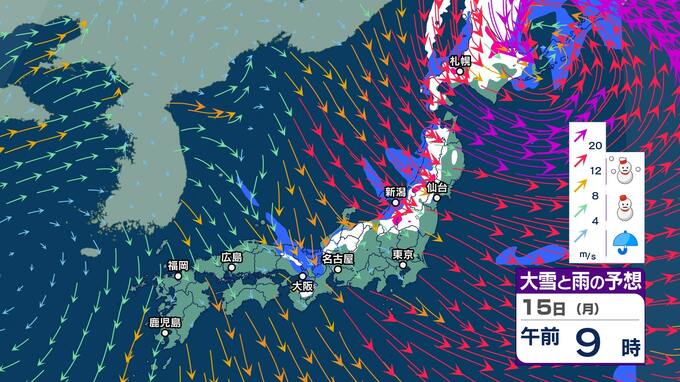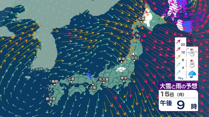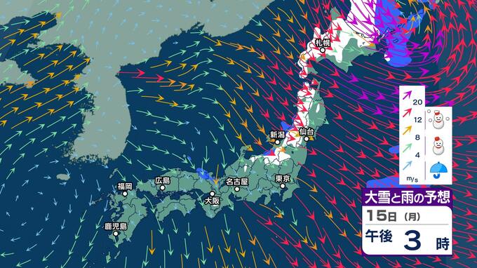 【大雪情報】東北北部は大雪となる所がある見込み 大雪による交通障害に注意・警戒を 警報級の大雪となる可能性も…13日朝までの24時間降雪予想は東北日本海側・太平洋側の山沿いで50センチ 東北日本海側の平地で20センチ 東北太平洋側平地で15センチ【大雪と雨シミュレーション】 2025年12月12日(金) 11:28 国内 天気 15日(月)大雪と雨シミュレーション