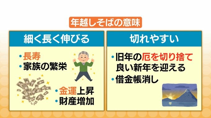 そばは「そば切り」とも言われ、細く長く伸びることから