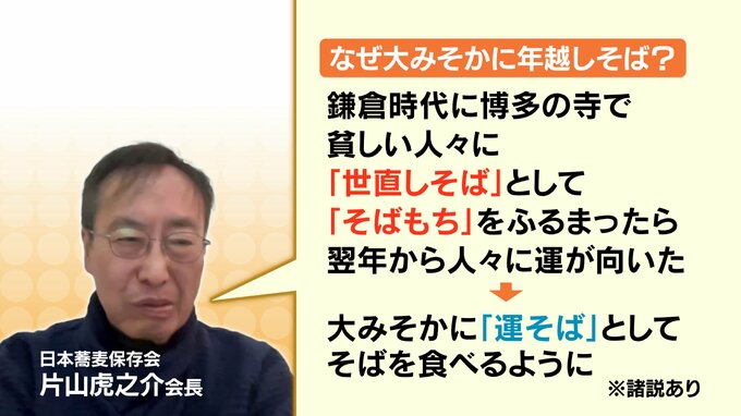 全国のそば処のプロデュースをしている、日本蕎麦保存会・片山虎之介会長によりますと、起源は様々ありますが、鎌倉時代に博多の寺で貧しい人々に「世直しそば」として「そば餅」をふるまったところ翌年から人々に運が向いたことから大みそかに「運そば」といってそばを食べる習慣が始まったそうです。