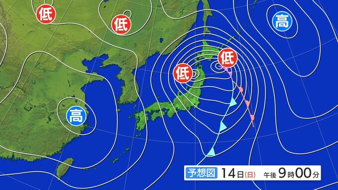 14日は、四国の南の低気圧が急速に発達しながら本州の太平洋側を通って北海道付近に進み、日本海西部の低気圧も急速に発達しながら東北地方へ進むでしょう。15日は、東北地方の低気圧は不明瞭になり、北海道付近の低気圧が千島近海に進んで日本付近は冬型の気圧配置となる見込みです。これらの急速に発達する低気圧の影響で、北日本と北陸地方では15日にかけて大荒れとなる見込みです。
