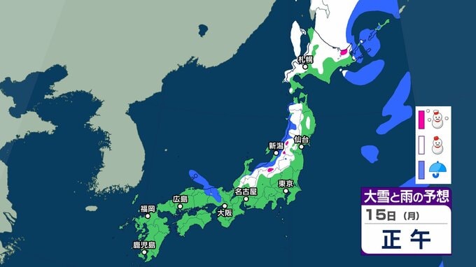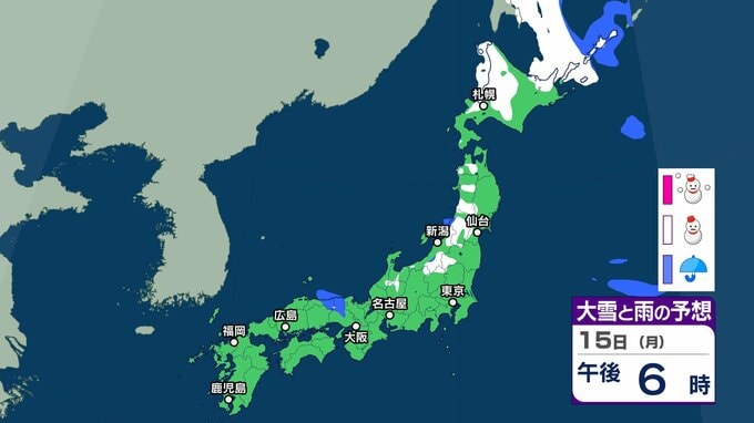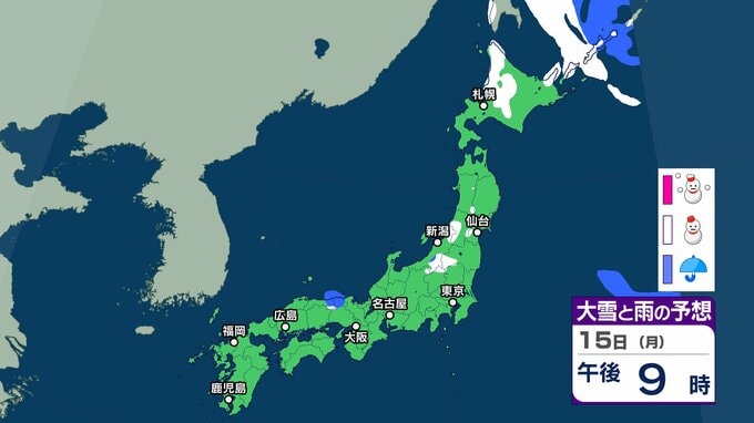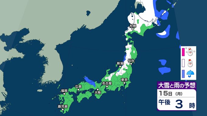 ニュースクリップ 【気象情報】北日本、北陸は16日にかけ暴風雪と高波に警戒 北海道は警報級の大雪と高潮のおそれ 交通障害に注意【雪と雨のシミュレーション】 2025年12月15日(月) 15:06 国内 天気 15日(月)雪と雨のシミュレーション
