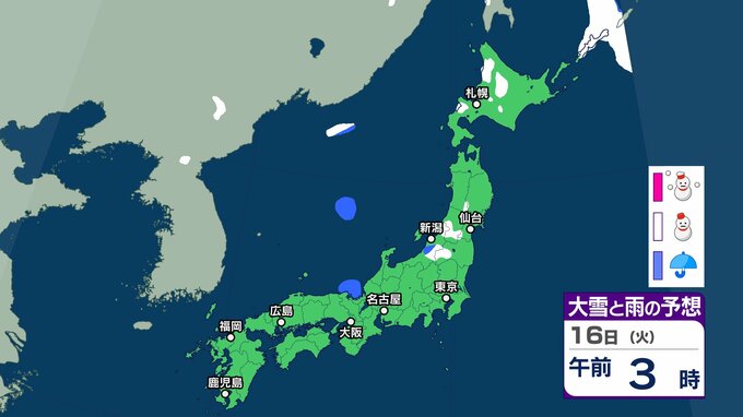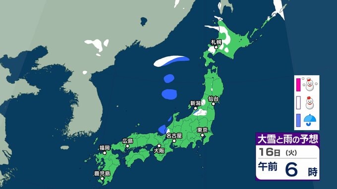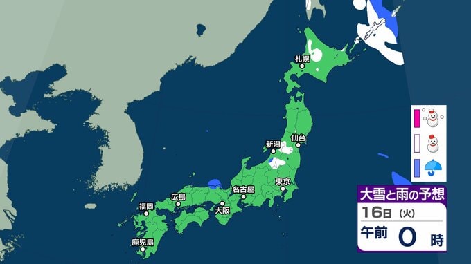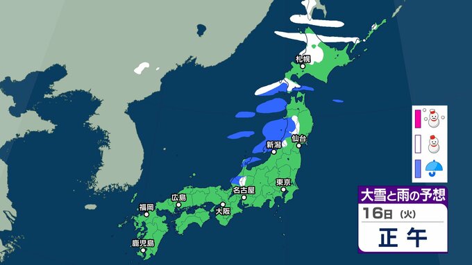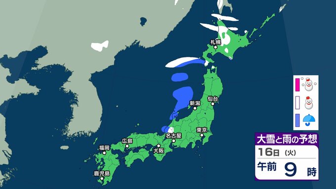 ニュースクリップ 【気象情報】北日本、北陸は16日にかけ暴風雪と高波に警戒 北海道は警報級の大雪と高潮のおそれ 交通障害に注意【雪と雨のシミュレーション】 2025年12月15日(月) 15:06 国内 天気 16日(火)雪と雨のシミュレーション