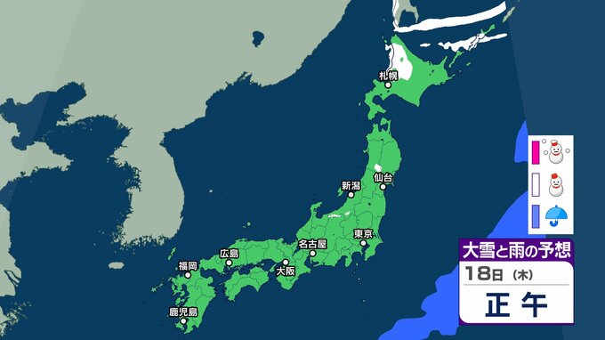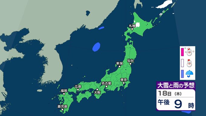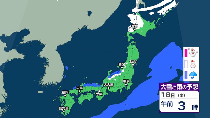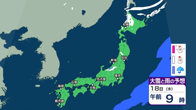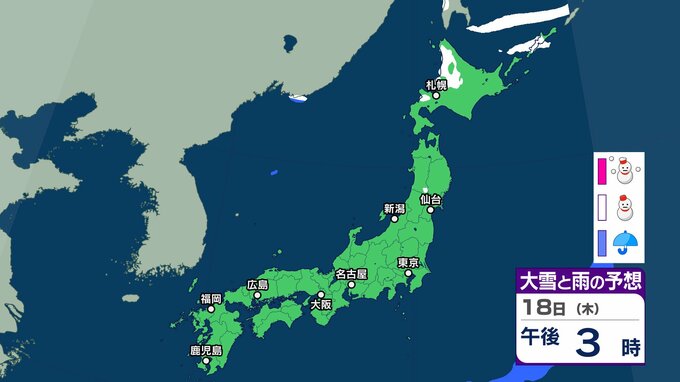 ニュースクリップ 【気象情報】北日本、北陸は16日にかけ暴風雪と高波に警戒 北海道は警報級の大雪と高潮のおそれ 交通障害に注意【雪と雨のシミュレーション】 2025年12月15日(月) 15:06 国内 天気 18日(木)雪と雨のシミュレーション