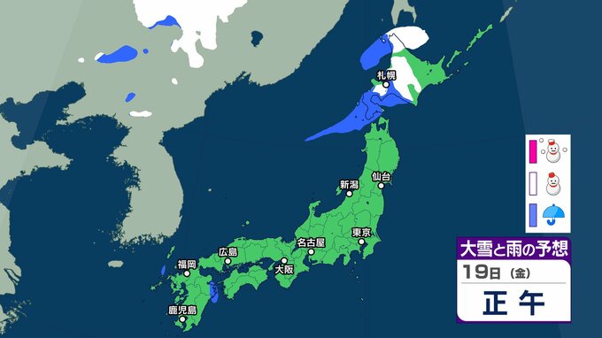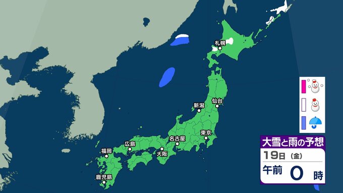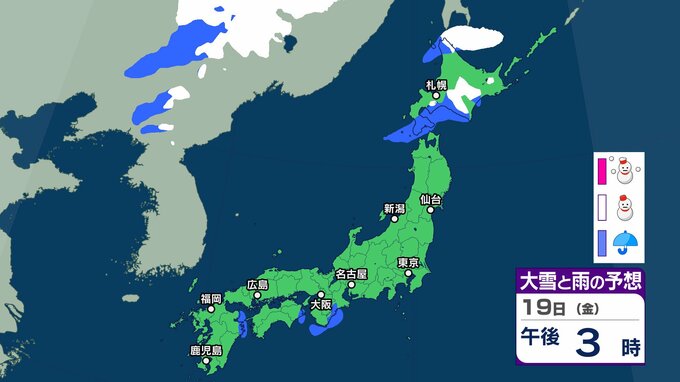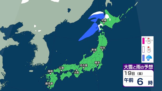 ニュースクリップ 【気象情報】北日本、北陸は16日にかけ暴風雪と高波に警戒 北海道は警報級の大雪と高潮のおそれ 交通障害に注意【雪と雨のシミュレーション】 2025年12月15日(月) 15:06 国内 天気 19日(金)雪と雨のシミュレーション