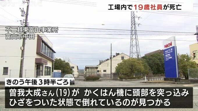 16日、富山市の「不二越」の工場で、19歳の男性社員がかくはん機に頭が入った状態で倒れているのが見つかり、搬送先の病院で死亡が確認されました。