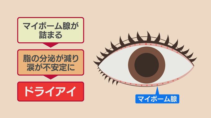 まぶたの内側には、眼球を覆う涙を安定させるために脂を分泌する「マイボーム腺」があり、マイボーム腺がつまると、涙が不安定となり、ドライアイを引き起こします。