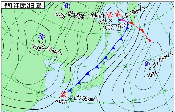 気象庁の短期予想解説よりますと、21日は寒冷前線がオホーツク海の低気圧から北海道地方、日本海を経て対馬海峡付近にのびています。