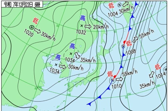 気象庁の短期予報解説資料によりますと、日本付近の週明け22日(月)は、前線を伴う低気圧が日本の東を東に進んでおり、オホーツク海では急速に発達した低気圧が東北東に移動しています。