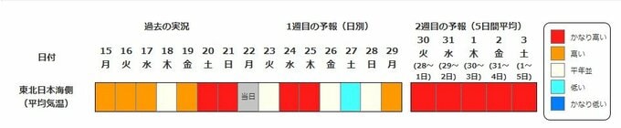 ニュースクリップ 年末年始は高温か…北海道、東北、関東甲信が対象 「10年に一度程度しか起きないような著しい高温」の可能性 12月29日~1月5日にかけて 気象庁が早期天候情報を発表 2025年12月22日(月) 14:52 国内 天気 1月3日までの気温予報