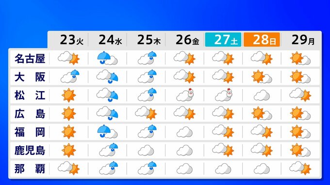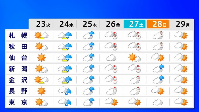 ニュースクリップ 年末年始は高温か…北海道、東北、関東甲信が対象 「10年に一度程度しか起きないような著しい高温」の可能性 12月29日~1月5日にかけて 気象庁が早期天候情報を発表 2025年12月22日(月) 14:52 国内 天気 23日から29日の週間予報
