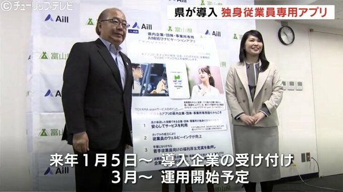 22日、県民会館で行われた県子育て支援・少子化対策県民会議で発表されたのは県内の企業や団体の独身従業員専用のアプリ「TOYAMAgoen」。