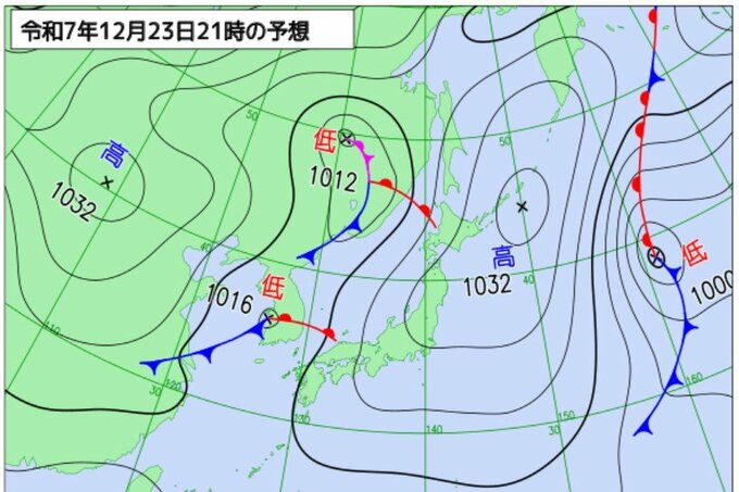 ニュースクリップ 【気象】クリスマスイブの24日から25日にかけて雨、強風や高波に注意…低気圧の発達で荒天のおそれ、東海や近畿 100ミリの降雨予測も【雨と風のシミュレーション】 2025年12月23日(火) 07:57 国内 天気 低気圧が日本海から北日本へ進む 24日朝には紀伊半島沖の気圧の谷に低気圧が発生し、また別の低気圧が本州南岸を東進する見込みです。さらに23日夜までには華中で発生した低気圧が、25日にかけて日本海から北日本を通って千島近海へ進みます。 予想天気図 23日午後9時 気象庁