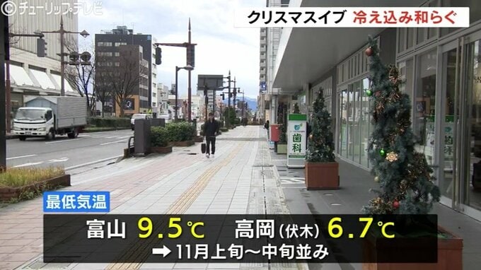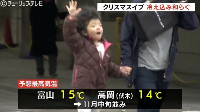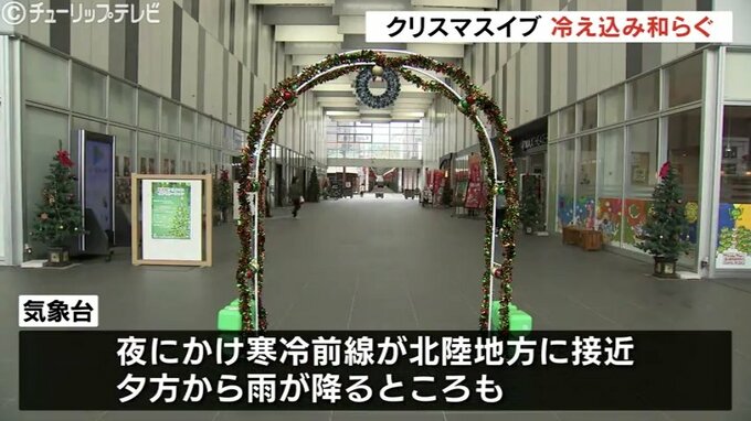 クリスマスイブの24日、富山県内は湿った空気の影響を受け曇りとなっています。予想最高気温は11月中旬並みで、冷え込みが和らぐ一日となりそうです。