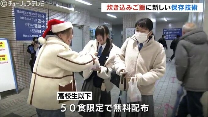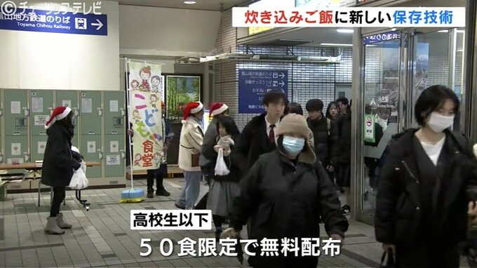 新しい保存技術を使って腐りにくくなった炊き込みご飯が、富山市の電鉄富山駅で無料配布されました。