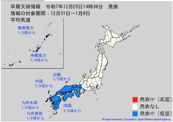 気象庁は25日、東北日本海側、長野県北部・群馬県北部、岐阜県山間部、近畿日本海側、山陰の各地方に「降雪量に関する早期天候情報」を発表しました。また、近畿、中国、四国、九州北部、九州南部、沖縄の各地方に「低温に関する早期天候情報」を発表しました。これらの地域では12月31日ごろから1月8日ごろにかけて、この時期としては10年に一度程度しか起きないような著しい降雪量や低温になる可能性があるとしています。
