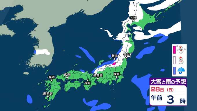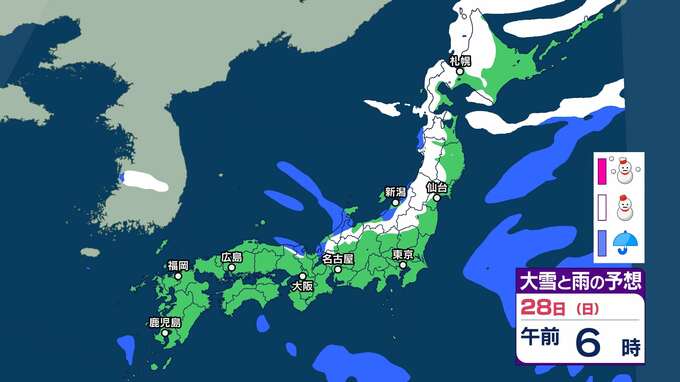 ニュースクリップ 【大雪情報】冬将軍が帰省ラッシュ直撃か 北陸の山沿いや山地では警報級の大雪に 海上は風が強く海は大しけやしけに【雨と雪のシュミレーション】 2025年12月26日(金) 16:11 国内 天気 28日(日)大雪と雨シミュレーション