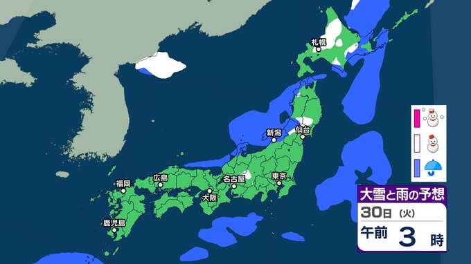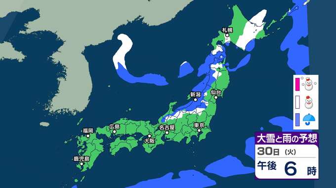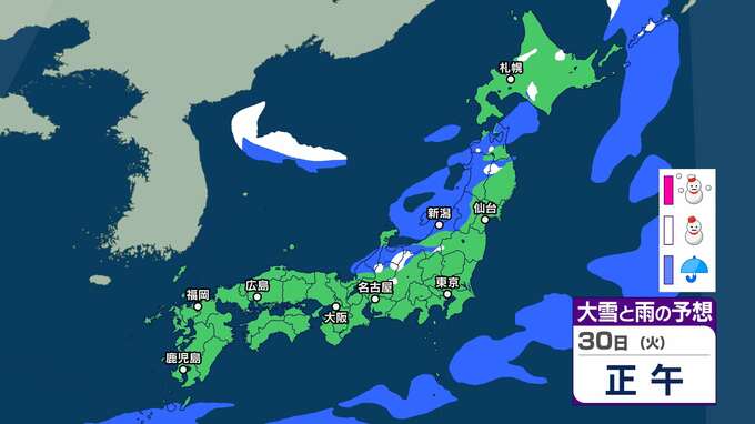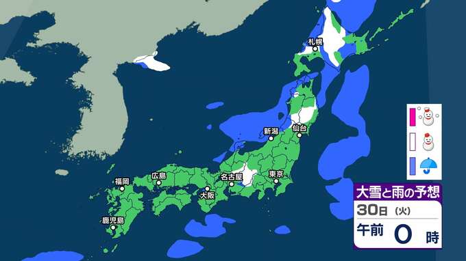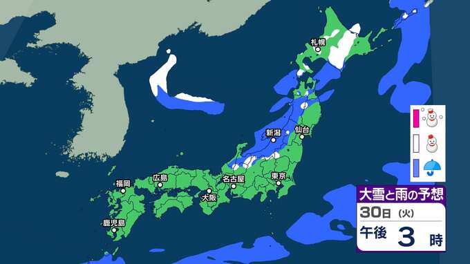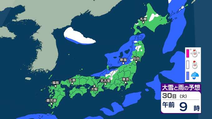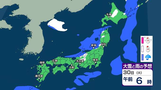 ニュースクリップ 【大雪情報】冬将軍が帰省ラッシュ直撃か 北陸の山沿いや山地では警報級の大雪に 海上は風が強く海は大しけやしけに【雨と雪のシュミレーション】 2025年12月26日(金) 16:11 国内 天気 30日(火)大雪と雨シミュレーション