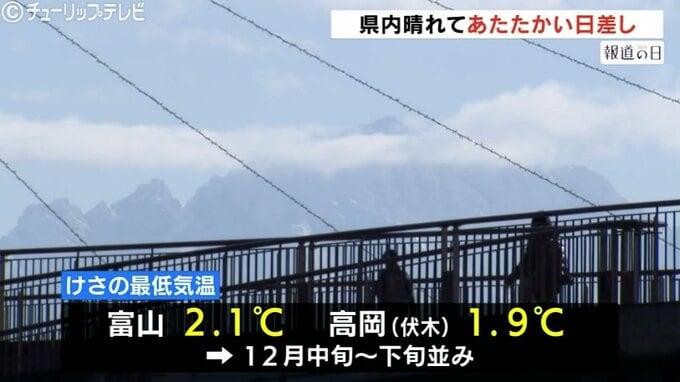 このあとも晴れの天気は続き、日中の予想最高気温は富山・高岡市の伏木ともに11℃と12月上旬並みとなりそうです。