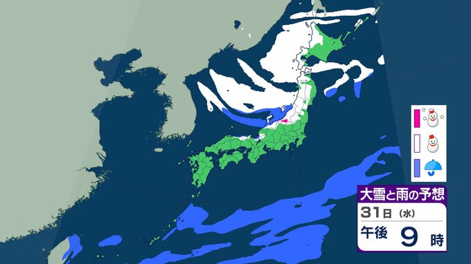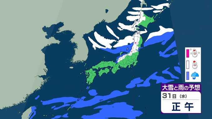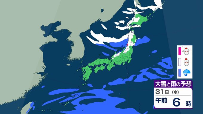 ニュースクリップ 東北日本海側 30日昼前にかけて、激しい突風や急な強い雨に注意を 気圧の谷が北日本を通過見込み【雨と雪のシミュレーション】 2025年12月29日(月) 17:32 国内 31日の雨と雪のシミュレーション