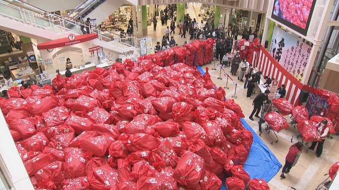 通常より1時間早い午前9時にオープンすると、客たちは衣類や食料品、雑貨などそれぞれお目当ての福袋を買い求めていました。