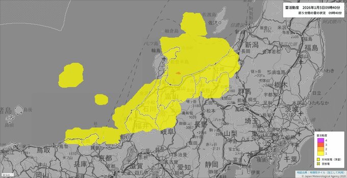 気象庁によりますと、北陸地方では、5日は冬型の気圧配置が強まり、上空約5500メートルに氷点下30度以下の寒気を伴った気圧の谷の影響を受ける見込みです。このため、北陸地方では大気の状態が非常に不安定となり、局地的に積乱雲が発達するでしょう。
