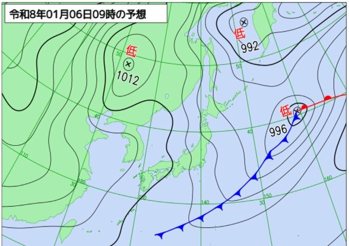 急速に発達する低気圧が日本海北部を東へ