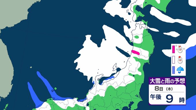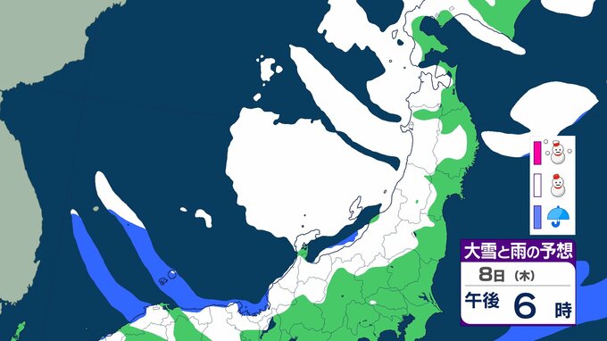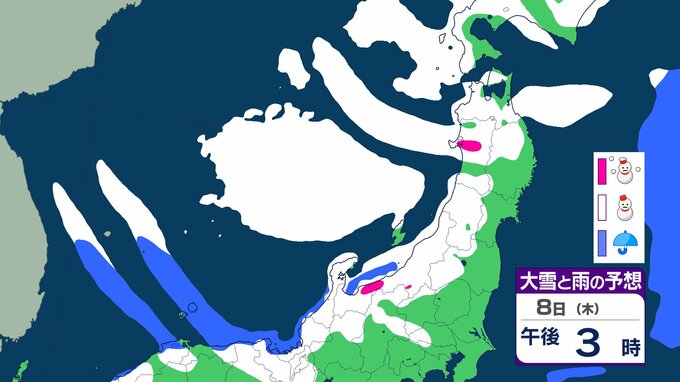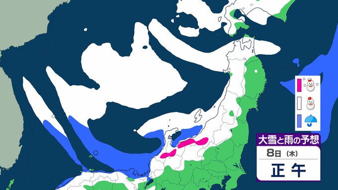 ニュースクリップ 【気象情報】北陸地方 マイナス30℃の寒気流入で積乱雲が発達 8日夜まで落雷、竜巻などの突風に注意 落雷や竜巻などの激しい突風、ひょうに注意 大気の状態が非常に不安定【雨と雪のシミュレーション】 2026年1月8日(木) 15:22 国内 天気 8日(木)雨と雪のシミュレーション