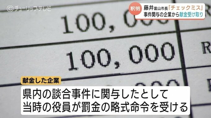 ニュースクリップ 「チェックミスだった」 藤井富山市長が指名停止企業から献金10万円 返金済みで収支報告書に記載 2026年1月8日(木) 20:07 国内 富山市の藤井市長が代表を務める自民党の支部が、談合事件で指名停止処分を受けていた企業から政治献金10万円を受け取っていたことがわかりました。藤井市長は取材に対し「チェックミスだった」と釈明し、すでに献…