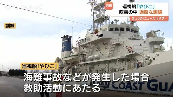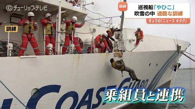 訓練は人が海で溺れている想定で行われ、潜水士ふたりが吹雪の中高さ8メートルの船の上から海に飛び込みました。