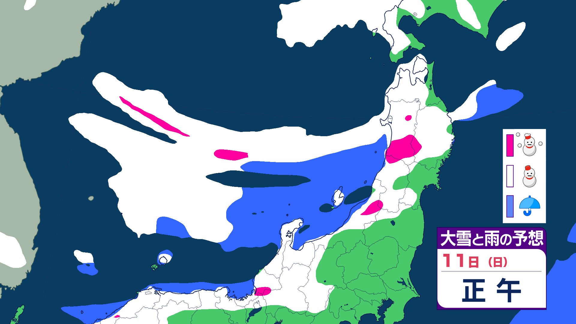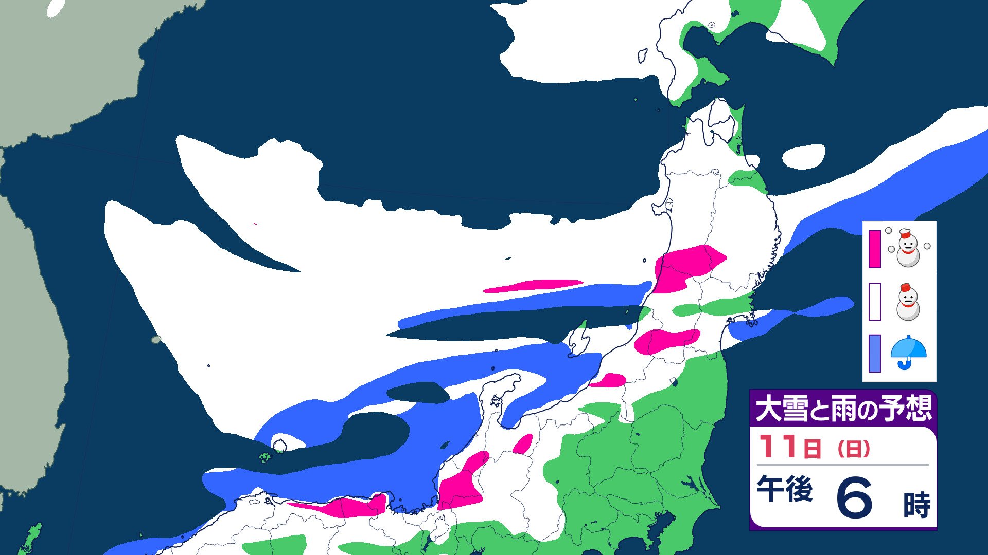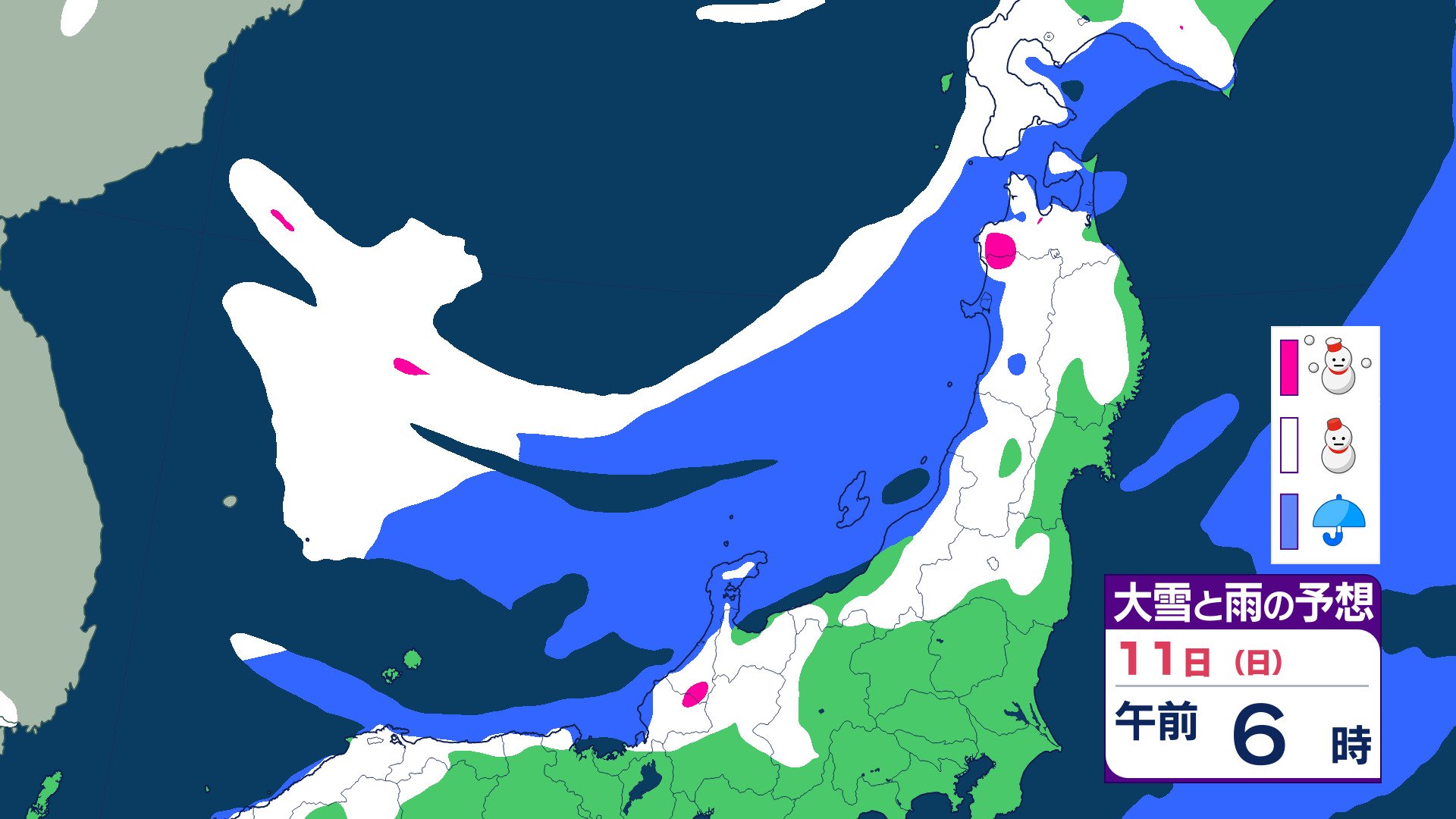 ニュースクリップ 【気象情報】東北日本海側 強い冬型の気圧配置で大雪のおそれ 雪雲停滞で“警報級”大雪の可能性も 【雨と雪のシミュレーション】 2026年1月8日(木) 19:47 国内 天気 11日(日)雨と雪のシミュレーション