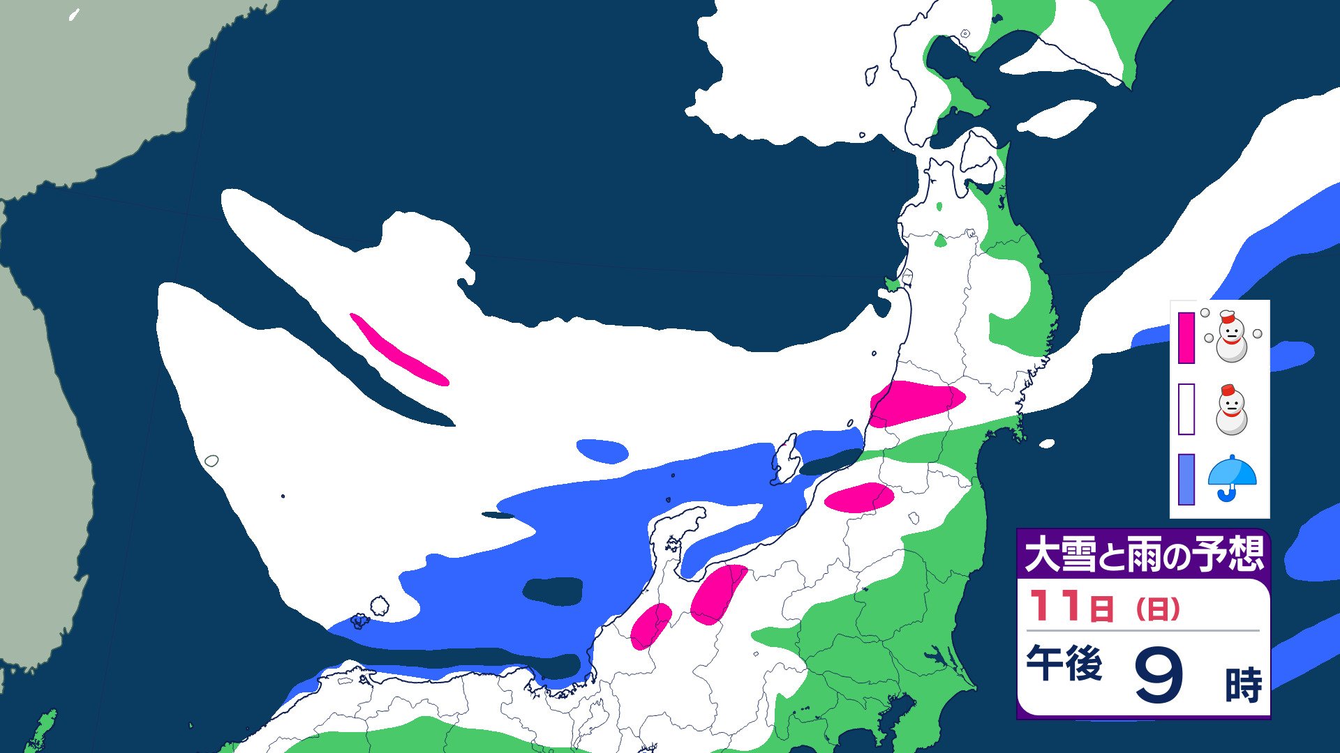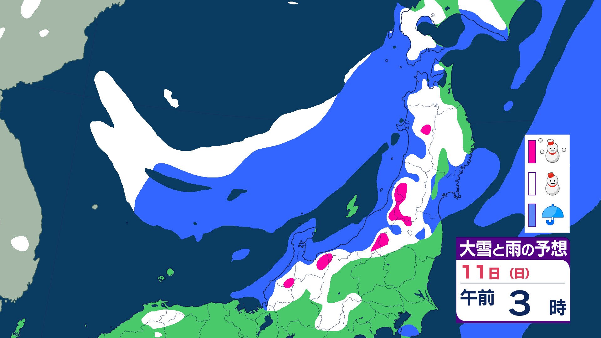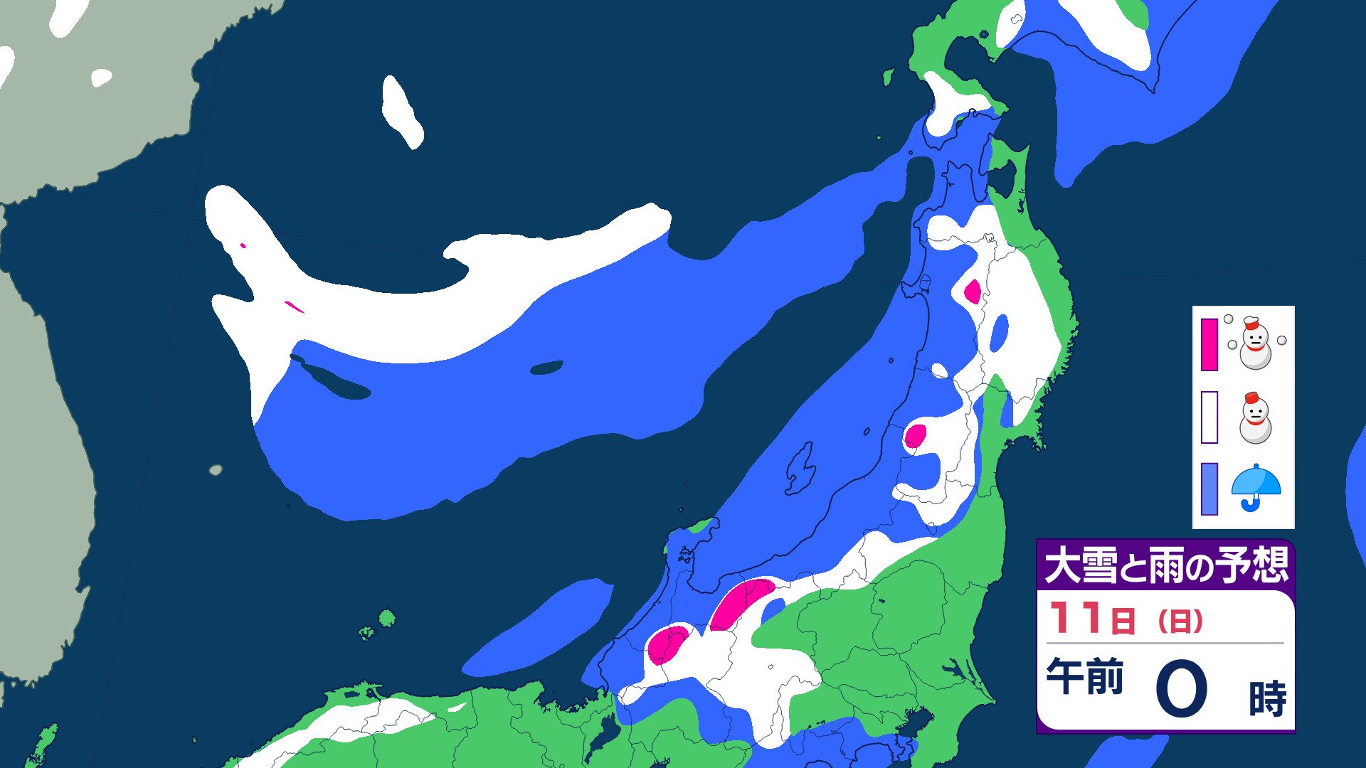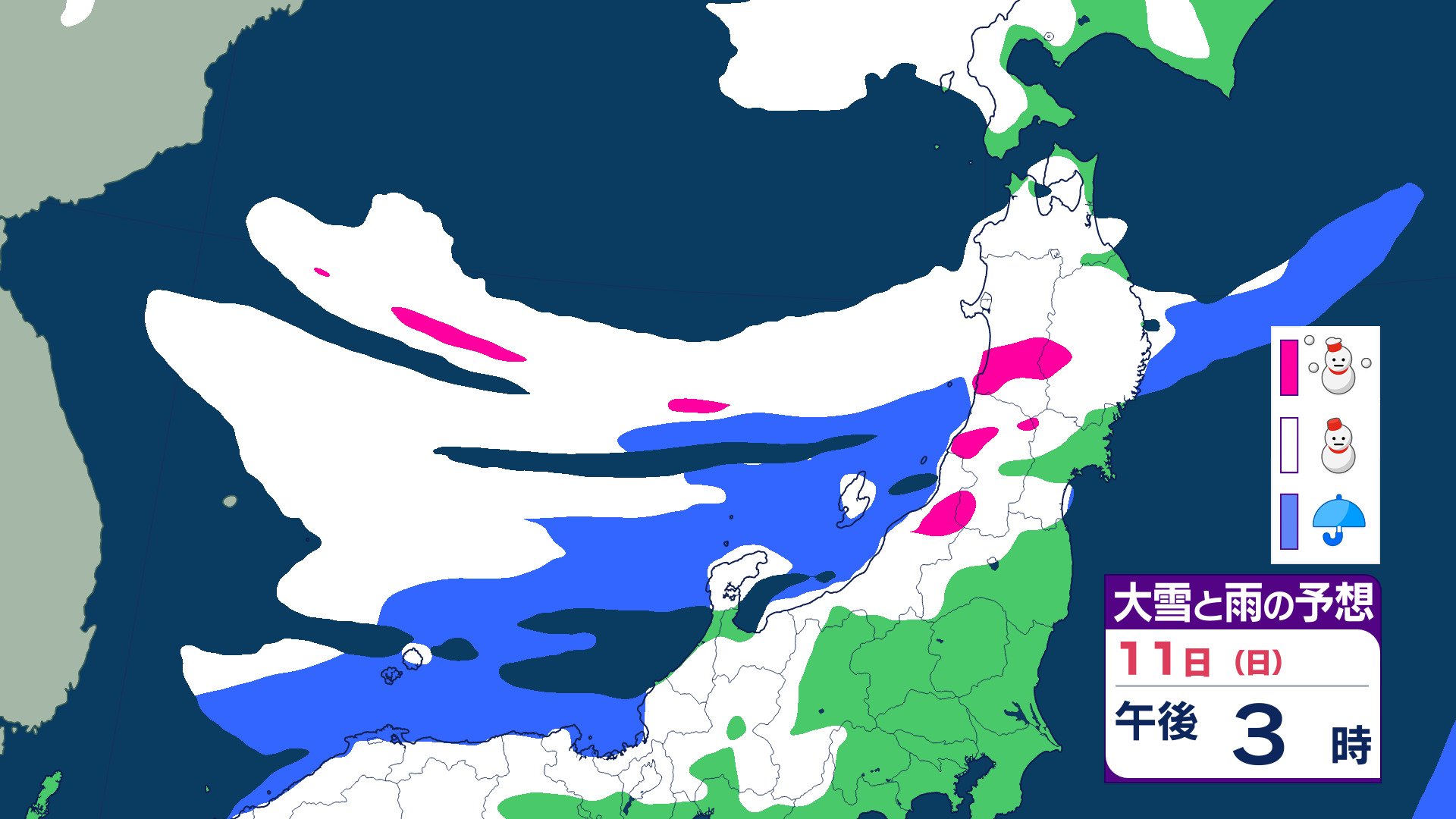 ニュースクリップ 【気象情報】東北日本海側 強い冬型の気圧配置で大雪のおそれ 雪雲停滞で“警報級”大雪の可能性も 【雨と雪のシミュレーション】 2026年1月8日(木) 19:47 国内 天気 11日(日)雨と雪のシミュレーション