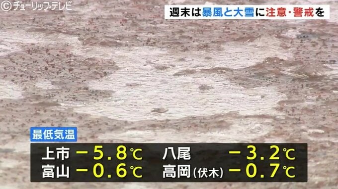 最低気温は、上市でマイナス5.8℃、八尾でマイナス3.2℃など、すべての観測地点で氷点下と厳しい冷え込みになりました。