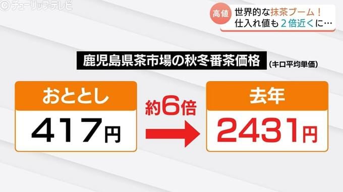 「抹茶がすごく売れるということもありまして、今まで緑茶を作られていた農家さんが今度その畑で抹茶を作ろうと、そうなりますと、今まで緑茶を作っていたものが無くなりますので、今度は緑茶のほうも値上げの影響というのが多少でてきております」