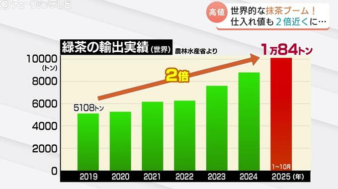 農林水産省によりますと、去年の抹茶を含む緑茶の輸出量は、日本食ブームの影響や健康志向の高まりにより、6年前と比べて2倍となっています。
