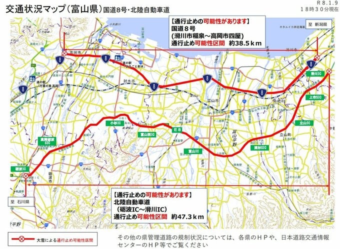 通行止めの可能性がある区間は、国道8号が富山県滑川市稲泉から富山県高岡市四屋までの約38.5km、北陸自動車道は砺波ICから滑川ICまでの約47.3kmです。