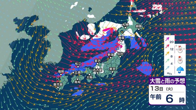 ニュースクリップ 関東甲信地方は11日昼前にかけて大気の状態が不安定に 落雷や竜巻などの激しい突風、急な強い雨に注意 降ひょうのおそれも【大雪と雪のシミュレーション】 2026年1月10日(土) 07:54 国内 天気 13日(火)大雪と雨シミュレーション