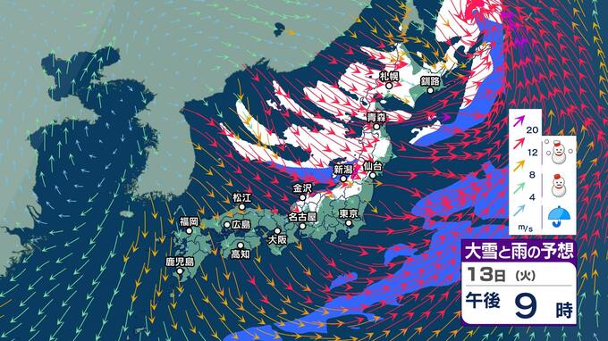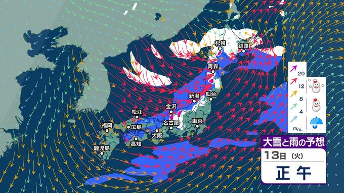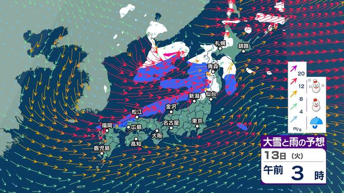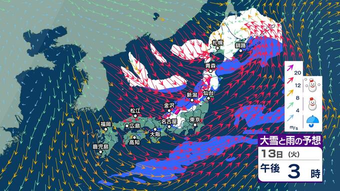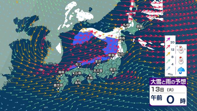【大雪情報】強い冬型の気圧配置へ→12日にかけ全国的に大荒れ 降雪予想は東北、北陸、東海 80cm 近畿60cm 北海道、関東甲信、中国:50cm 車の運転は冬用タイヤ必須 立ち往生に備えを【気象庁雪風シミュレーション/11日正午更新】 8時間前