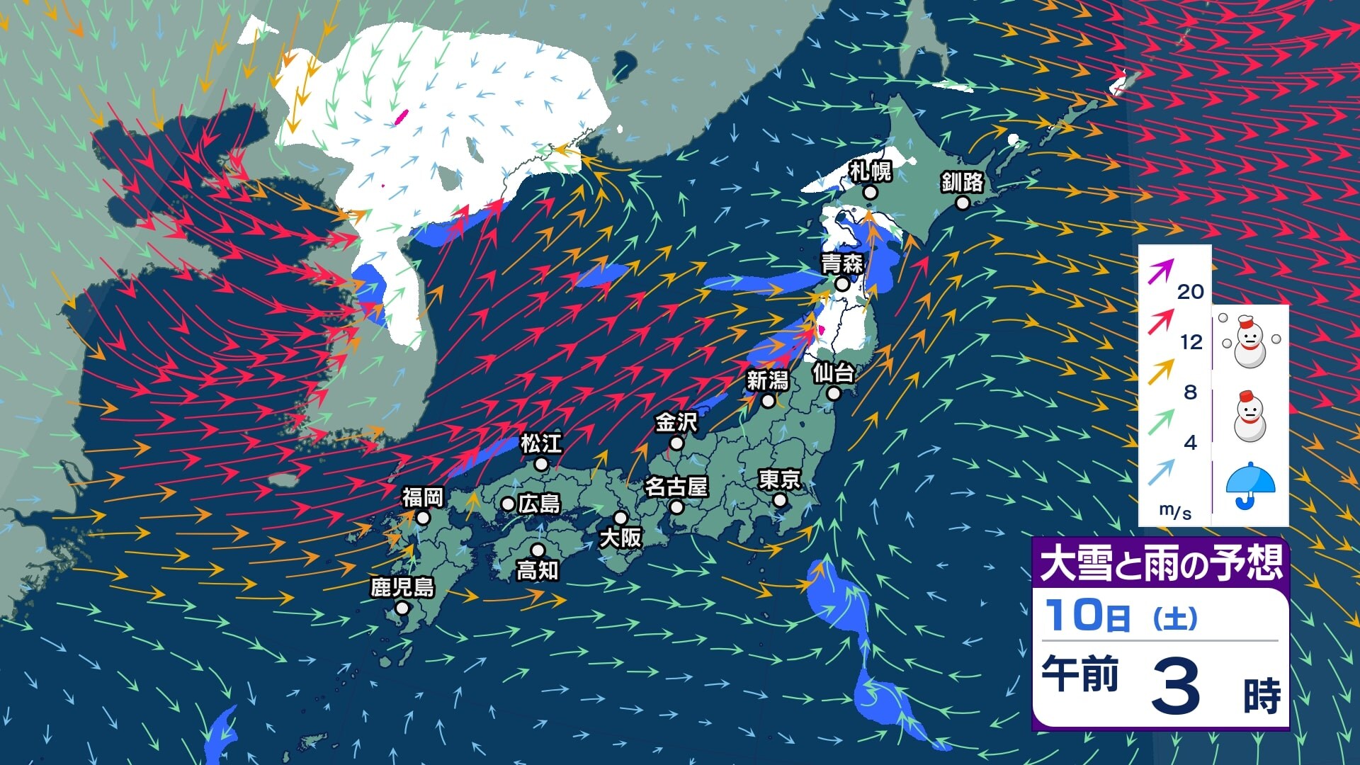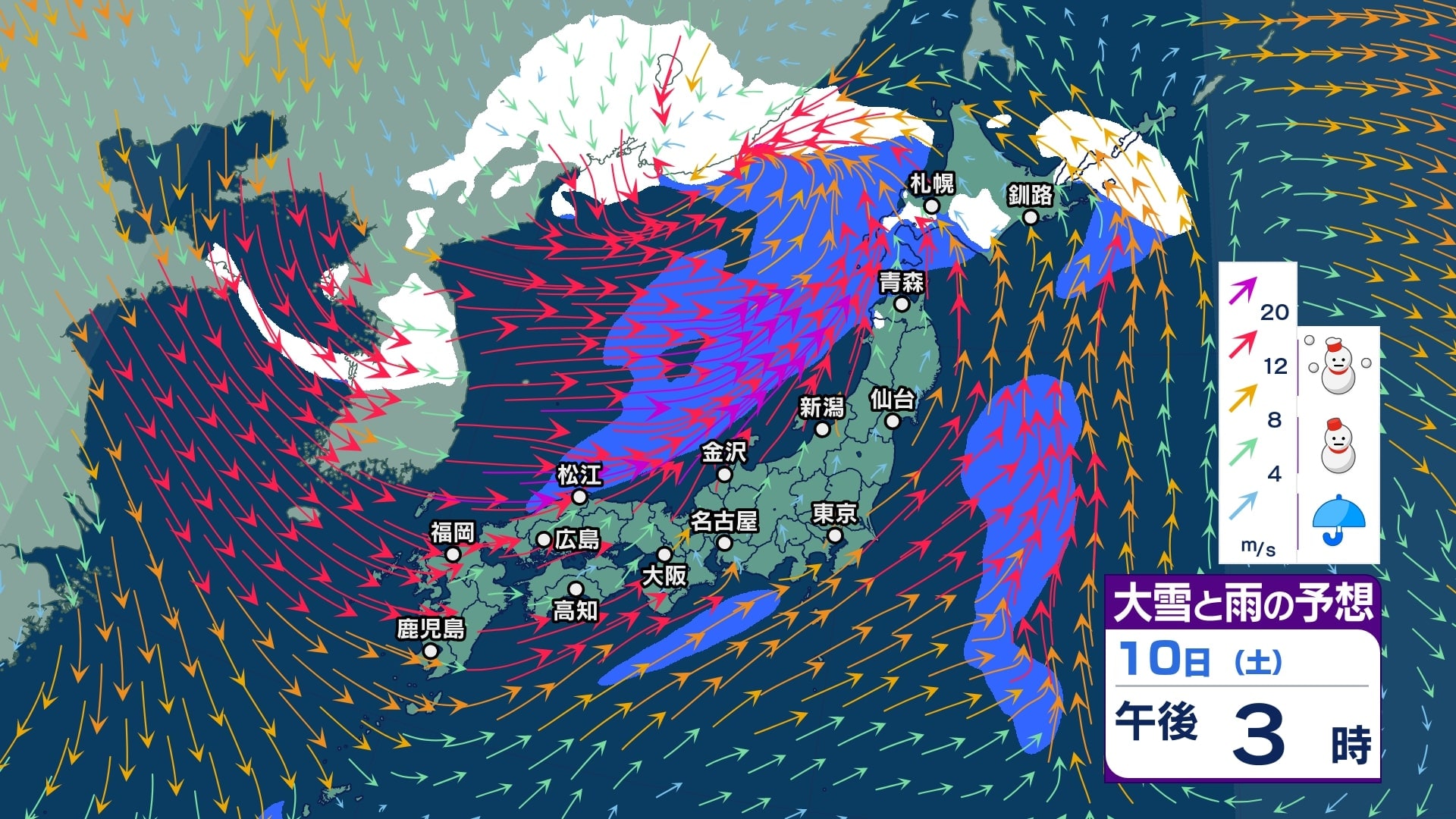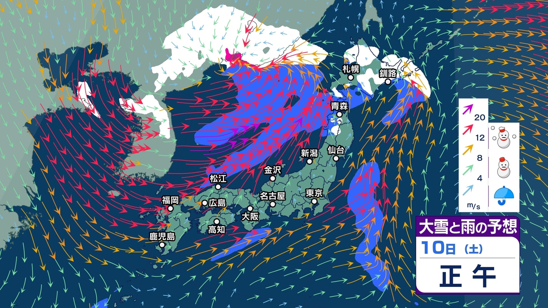 ニュースクリップ 【大雪予報】関東北部で40センチ甲信で50センチの降雪か 12日朝までの24時間予想 長野県と関東地方北部では大雪となる所がある見込み 積雪や路面の凍結による交通障害に警戒し、着雪やなだれにも注意【大雪と雪のシミュレーション】 2026年1月10日(土) 14:57 国内 天気 10日(土)大雪と雨シミュレーション