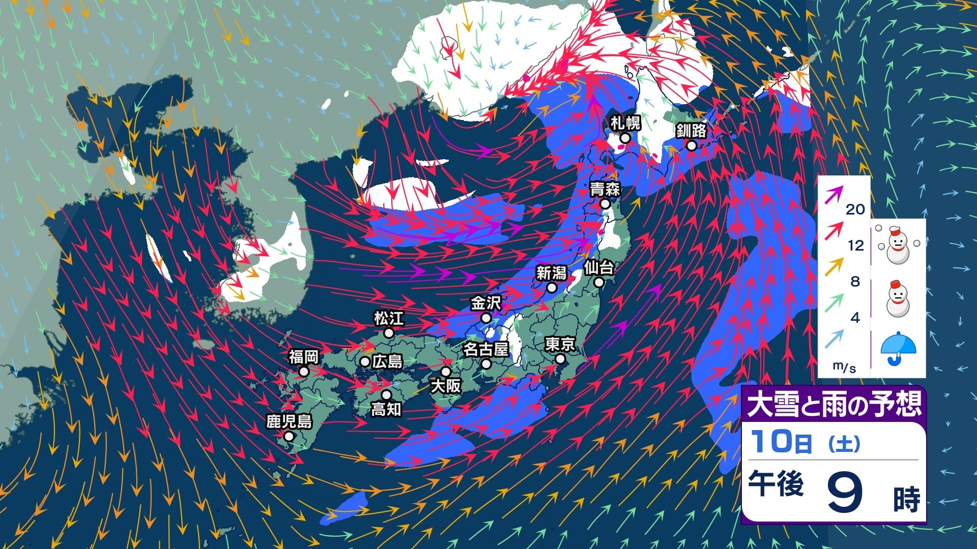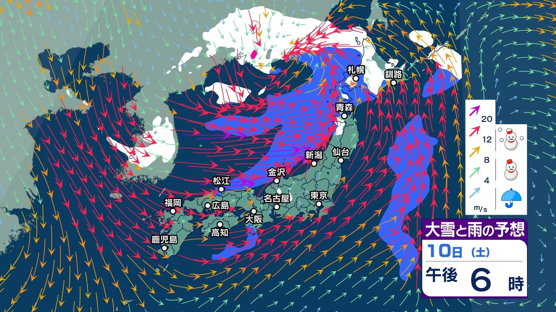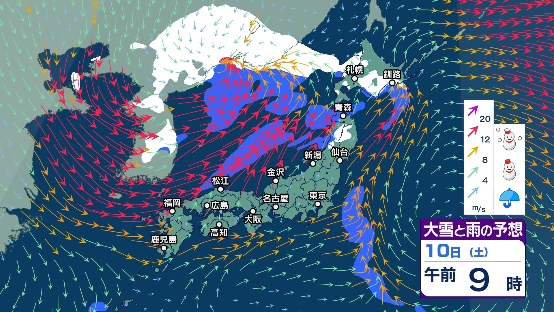 ニュースクリップ 【大雪予報】関東北部で40センチ甲信で50センチの降雪か 12日朝までの24時間予想 長野県と関東地方北部では大雪となる所がある見込み 積雪や路面の凍結による交通障害に警戒し、着雪やなだれにも注意【大雪と雪のシミュレーション】 2026年1月10日(土) 14:57 国内 天気 10日(土)大雪と雨シミュレーション