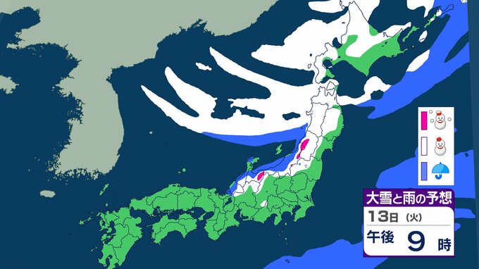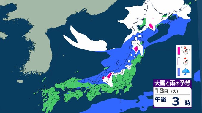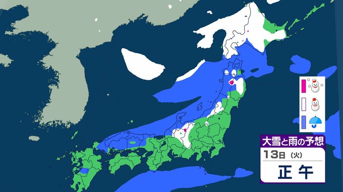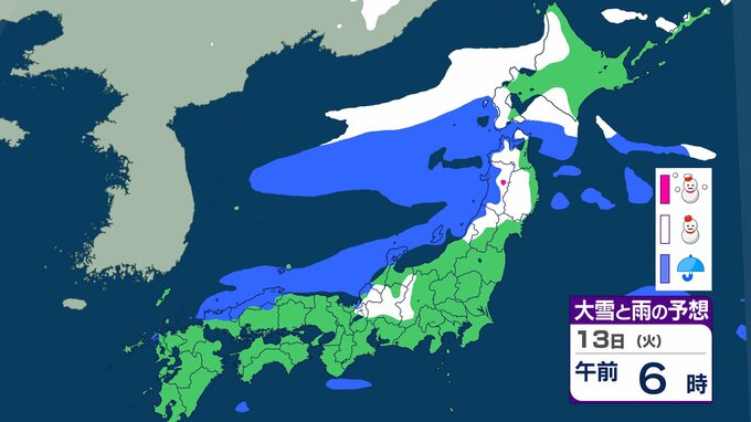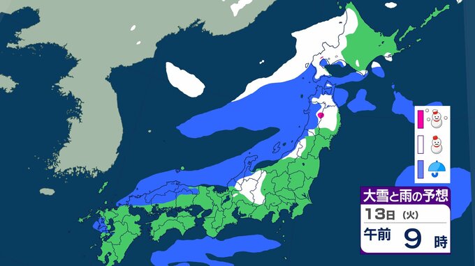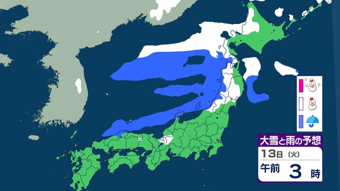 ニュースクリップ 【大雪情報】関東甲信でも大雪に警戒 北日本と東日本で大雪や猛ふぶき 最大降雪量80cm 交通障害に注意・警戒 【大雪と雨のシミュレーション】 2026年1月11日(日) 10:15 国内 天気 13日(火)の雨と雪のシミュレーション