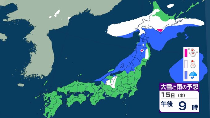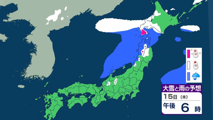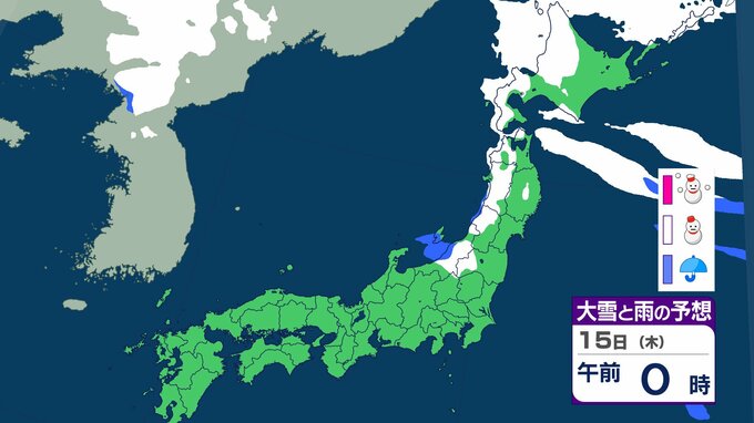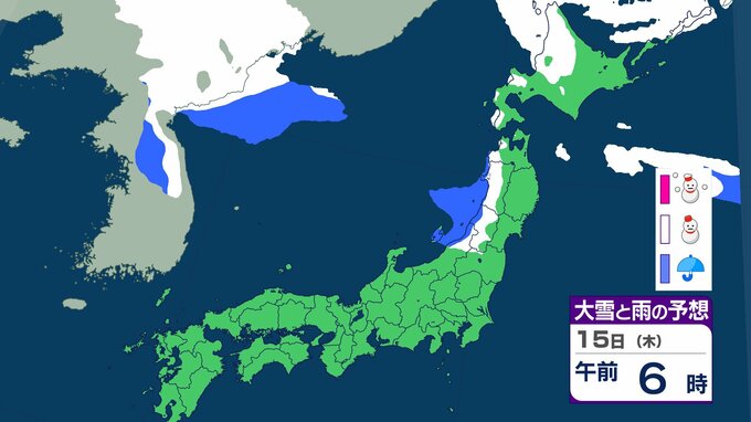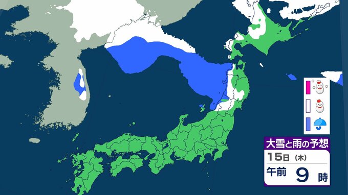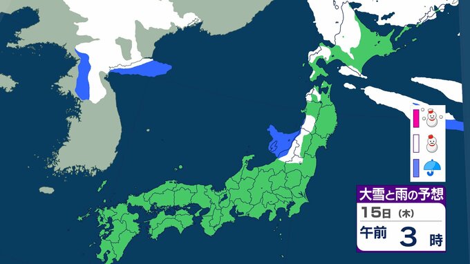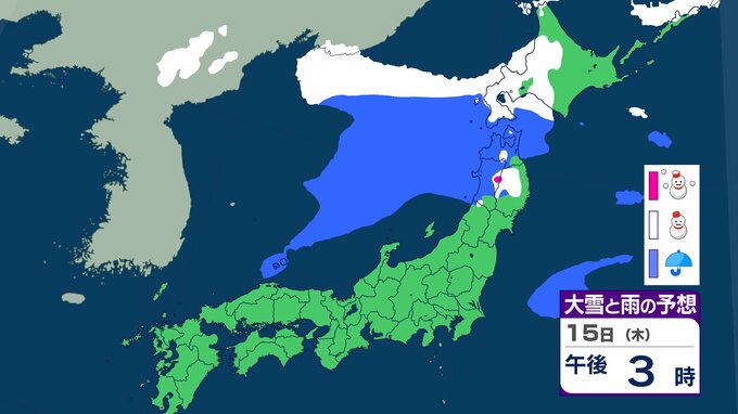 ニュースクリップ 【大雪情報】関東甲信でも大雪に警戒 北日本と東日本で大雪や猛ふぶき 最大降雪量80cm 交通障害に注意・警戒 【大雪と雨のシミュレーション】 2026年1月11日(日) 10:15 国内 天気 15日(木)の雨と雪のシミュレーション